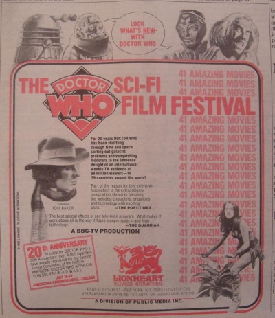 - 16 June 1982: Variety Magazine features a front page ad for the 41 Tom Baker omnibus serials - calling it a SCI-FI FILM FESTIVAL; the ad also publicises the upcoming Panopticon West convention.