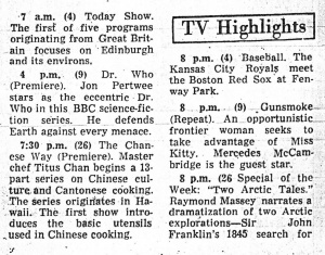 • December 1972: The debut screening of the Jon Pertwee stories is listed in the Washington Evening Star TV guide for the week starting Monday 4 December 1972, screening weekdays at 4.00pm. The synopsis in the HIGHLIGHTS section of the paper suggests that the first serial was The Mind of Evil. However, despite being listed in that same time slot Monday through Friday, Doctor Who was not listed the following week. Nor the week after that – in fact, it wasn't listed again until June 1973! It seems that the series had been scheduled to start in December 1972, but for whatever reason it was pulled at the last moment.