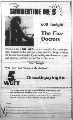 - 1982: Doctor Who producer John Nathan-Turner screened Castrovalva and Four to Doomsday for fans at the UF campus.